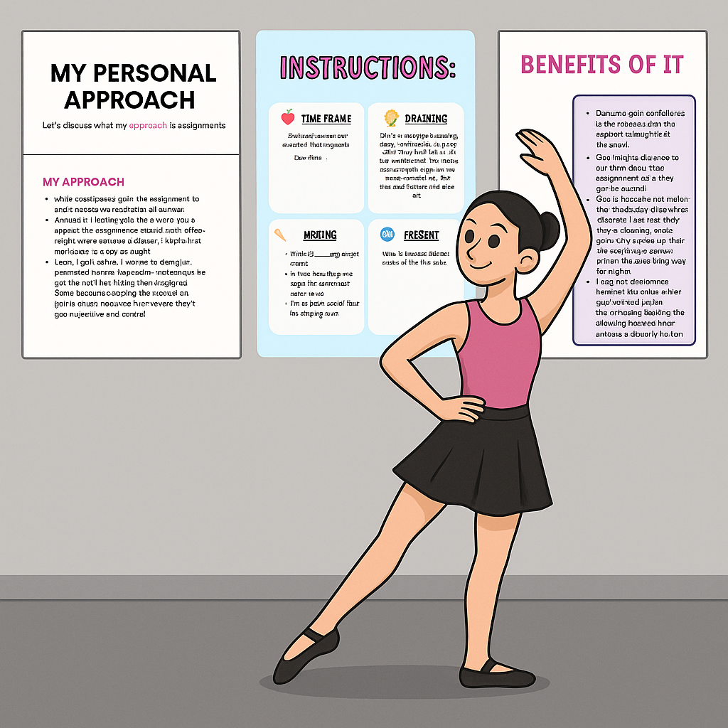- An intro page discussing my approach to assignments- such as how I avoid competitions and recitals